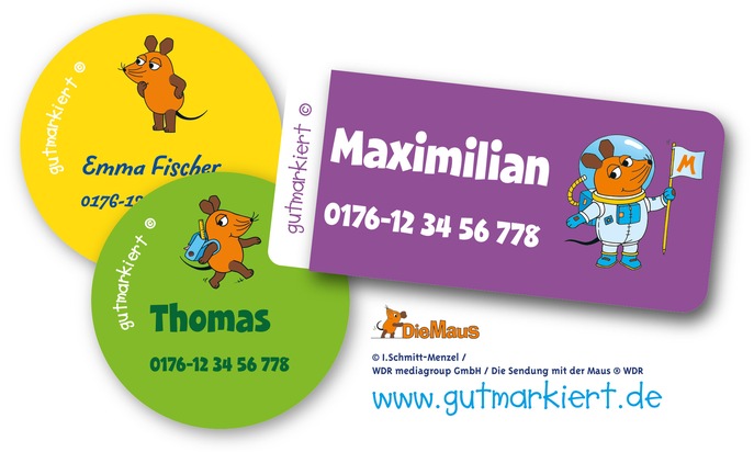Seit 2003 macht das Unternehmen "Gutmarkiert" die Besitztümer von Kindern unverwechselbar: Personalisierte bunte Aufkleber und Bügeletiketten für alles, was jedes Kind gerne verliert oder verwechselt. Dank einer neuen Kooperation mit dem WDR bringt "Gutmarkiert" die widerstandsfähigen Sticker jetzt erstmalig mit den Symbolen der Maus, dem Elefanten und der Ente auf den Markt. Durch Symbole können auch schon kleine Kinder, die noch nicht lesen können, die eigenen Sachen wiedererkennen.