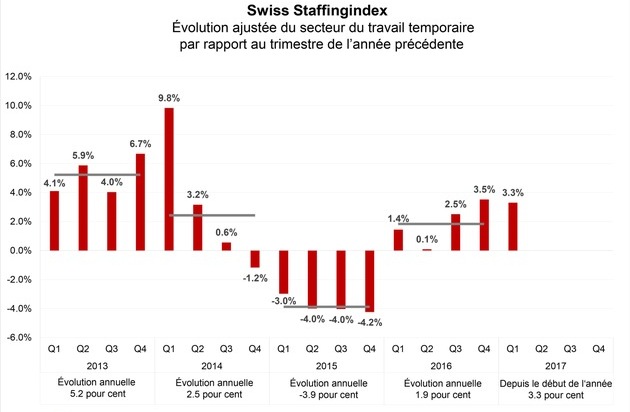 «La progression de 3,3 % lors du premier trimestre nous rend optimistes quant à l'évolution du secteur du travail temporaire en 2017», rapporte Marius Osterfeld, économiste chez swissstaffing. «L'économie continue de gagner du terrain. Chez swissstaffing, nous observons avec inquiétude les efforts grandissants de réguler le marché du travail suisse flexible. La croissance encore fragile serait très facilement étouffée par un monstre administratif tel que l'obligation d'annonce des postes vacants, tout comme la mise en oeuvre des nombreuses idées de régulation des syndicats.» L'évolution future du secteur du travail temporaire et de l'ensemble de l'économie se montrera tous les trimestres avec le Swiss Staffingindex.