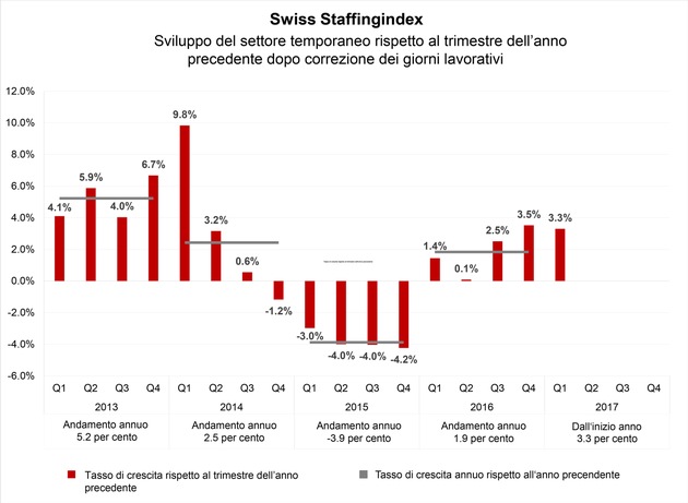 Nel 2016 le imprese di lavoro temporaneo svizzere hanno registrato l'1,9 per cento in più di ore di lavoro. Questo è quanto emerge dall'indicatore statistico Swiss Staffingindex, di recente introdotto dall'associazione settoriale swissstaffing. A documentarlo sono i dati di bilancio di circa 200 prestatori e collocatori di personale. Con il 3,3 per cento di ore lavorate in più nel primo trimestre 2017 lo Swiss Staffingindex fa intravedere per il 2017 un'ulteriore accelerazione dell'economia svizzera.