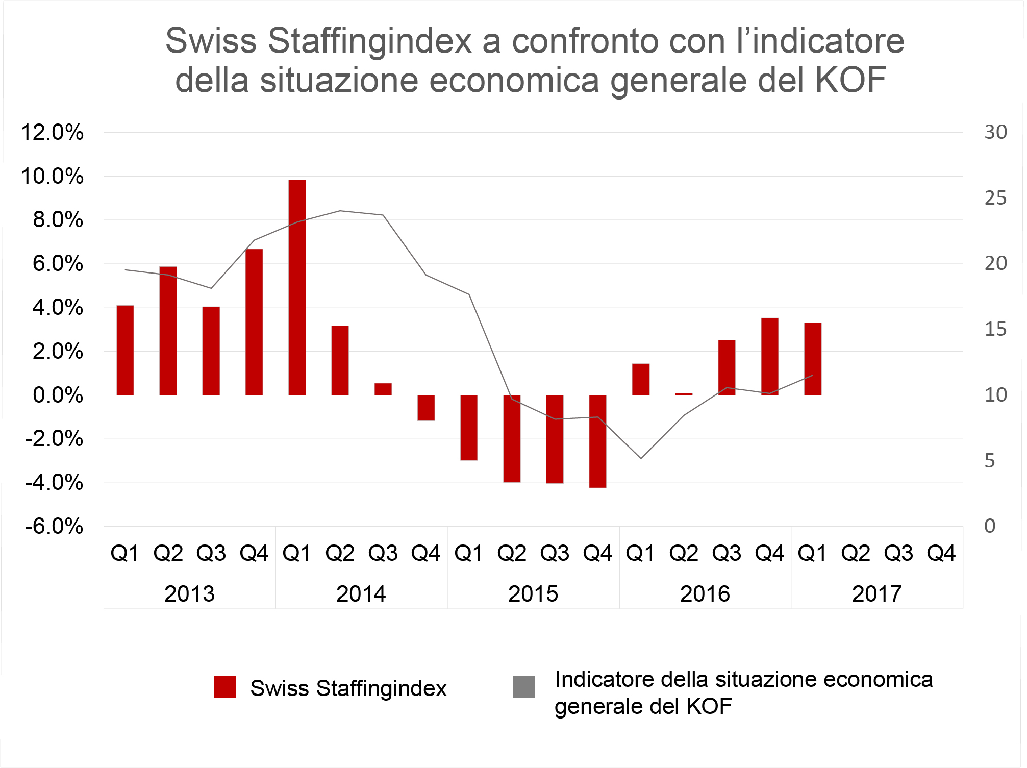 Il settore del lavoro temporaneo è un indicatore dell'economia svizzera. Le imprese di lavoro temporaneo forniscono manodopera nel breve termine a tutti i settori economici. Anni di esperienza hanno insegnato a Georg Staub, Presidente di swissstaffing, che «l'aumentato fabbisogno di personale e una migliore situazione degli incarichi si avvertono immediatamente nei dati di bilancio dei prestatori e collocatori di personale». È quanto dimostra con estrema chiarezza lo Swiss Staffingindex. Lo shock del franco ha lasciato il settore del lavoro temporaneo a dover confrontarsi con cifre in profondo rosso. Nel 2015, le ore di lavoro prestate hanno subito un crollo che ha toccato la soglia del 4 per cento. Si tratta della valuta utilizzata dal settore. Dalla metà del 2016 emergono incoraggianti segnali di crescita. Negli ultimi tre trimestri, il settore ha potuto registrare un'espansione nettamente superiore al 2 per cento rispetto allo stesso periodo dell'anno precedente.