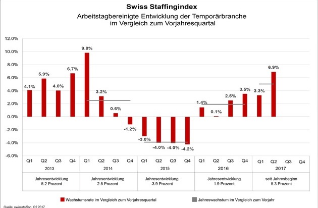 Die Schweizer Wirtschaft erholt sich. Das ist gut für die rund 800 Temporärunternehmen in der Schweiz, die für Grosskonzerne und KMU in allen Branchen kurzfristig Personal rekrutieren. Gemäss dem Swiss Staffingindex leisteten die Temporärarbeitenden im zweiten Quartal 2017 rund 6,9 Prozent mehr Einsatzstunden. Ein klares Signal für ein Wiederaufflammen der Schweizer Konjunktur.