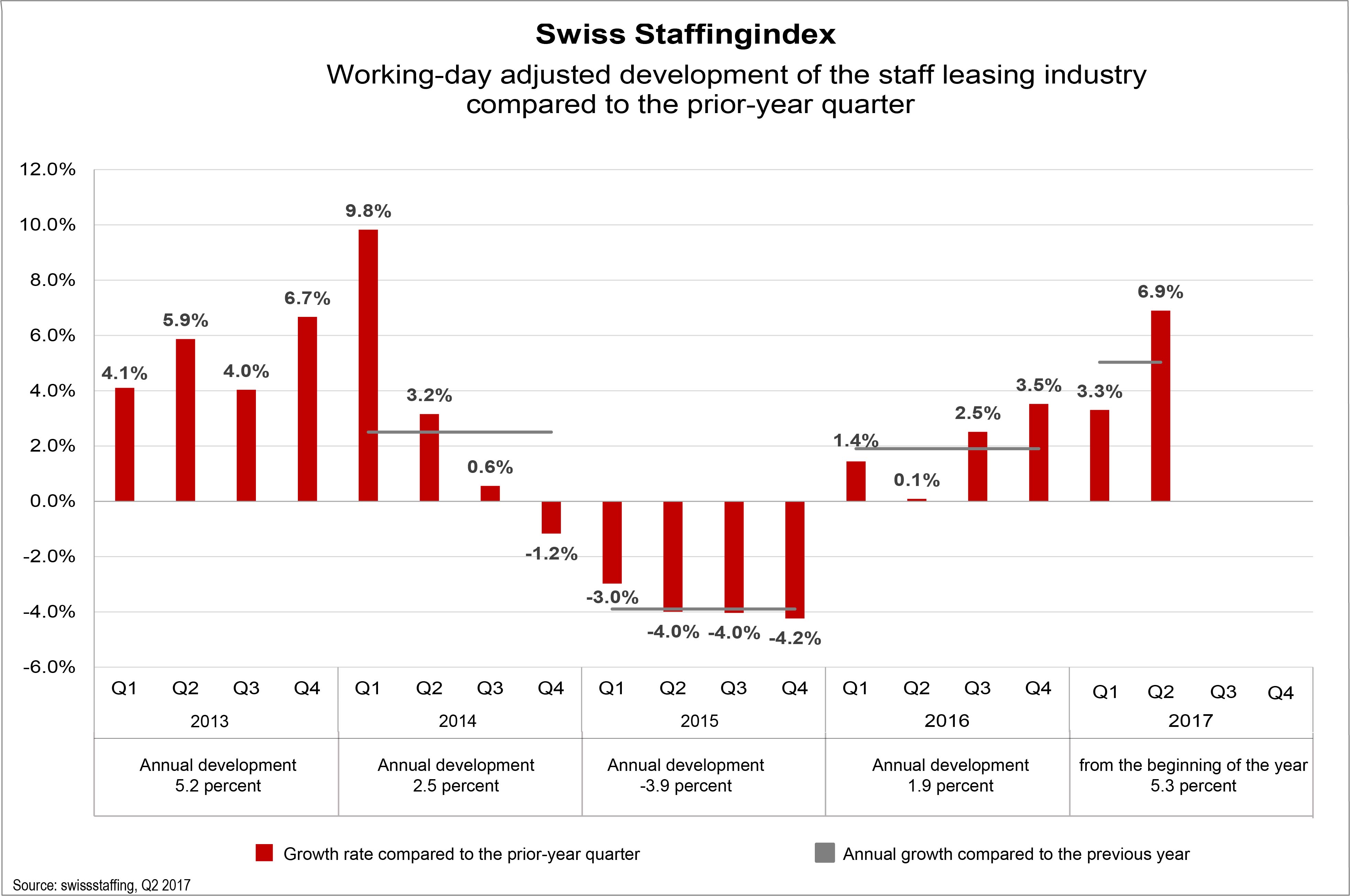 The Swiss economy is recovering. This is great news for the approximately 800 staff leasing companies in Switzerland, which recruit temporary staff for large corporations and SMES in all sectors. According to the Swiss Staffingindex, the number of hours worked by temporary workers rose by about 6.9% in the second quarter of 2017. This is a clear indication of an upturn in the Swiss economy.