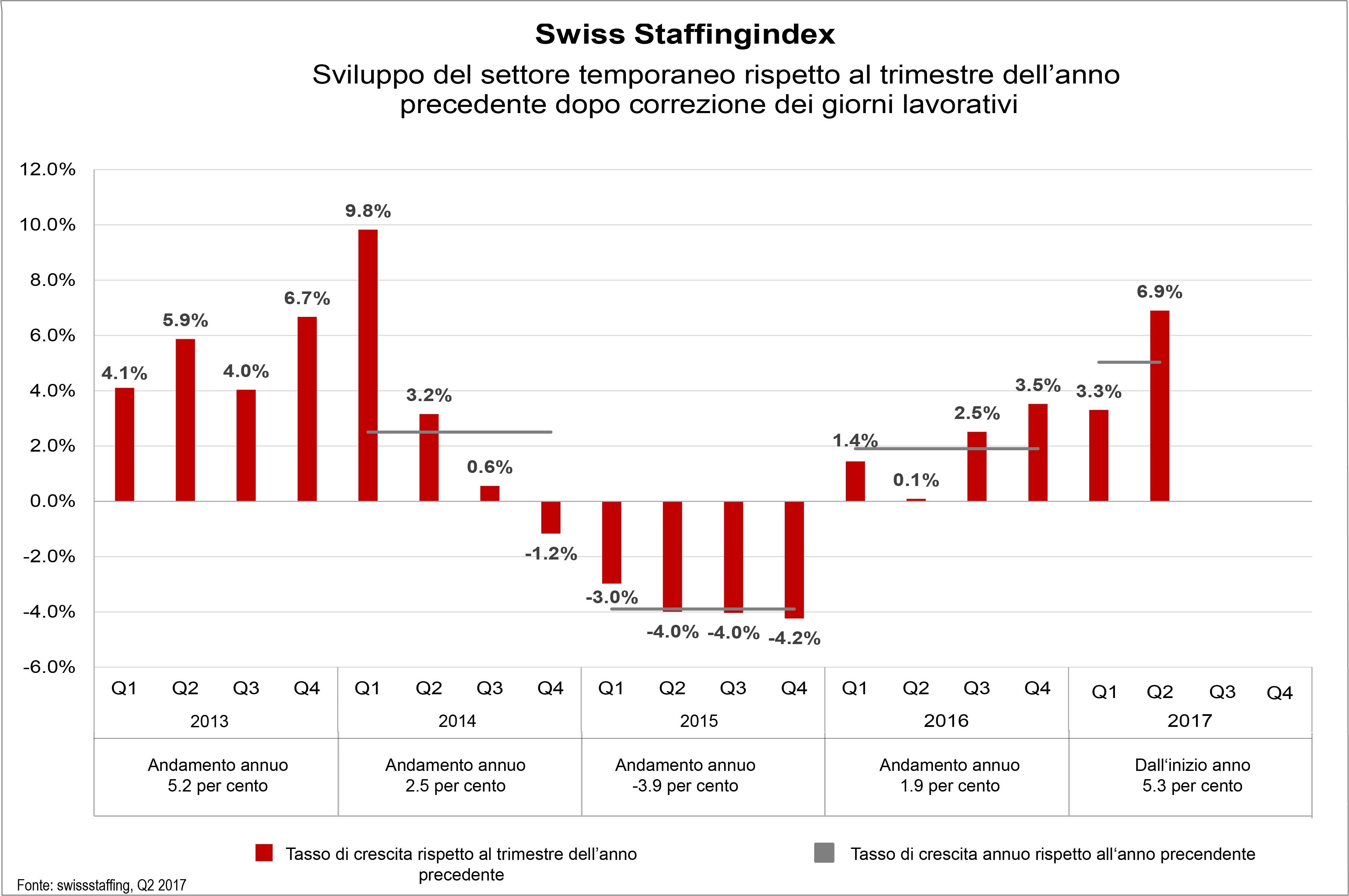 2012 2013 2014 2015 2016 2017 Q1 100 104.1 114.3 110.9 112.4 116.1 Q2 136.3 144.3 148.9 143.0 143.1 153.0 Q3 153.8 159.9 160.9 154.4 158.3 Q4 138.2 147.5 145.7 139.6 144.5 Fonte: swissstaffing, Q2/2017.