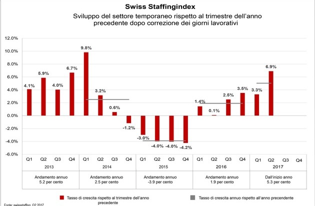 «Nel bilancio semestrale, il settore del lavoro temporaneo registra un aumento delle ore di lavoro prestate del 5,3%.», rileva Marius Osterfeld, economista presso swissstaffing. «A fronte della buona congiuntura mondiale e delle prospettive positive di crescita, il settore può dunque guardare con sguardo positivo alla seconda metà dell'anno.» Ciò nonostante bisogna procedere con umiltà. «Il franco tutt'ora forte e l'importante aumento dei salari reali potrebbero compromettere la lieve ripresa. Aumenti salariali in blocco realizzati tramite contratti collettivi di lavoro vanno considerati con cautela e riserbo. La buona situazione economica offre ad ogni collaboratore ed ad ogni collaboratrice una vasta gamma di possibilità per migliorare la propria situazione finanziaria e professionale.»