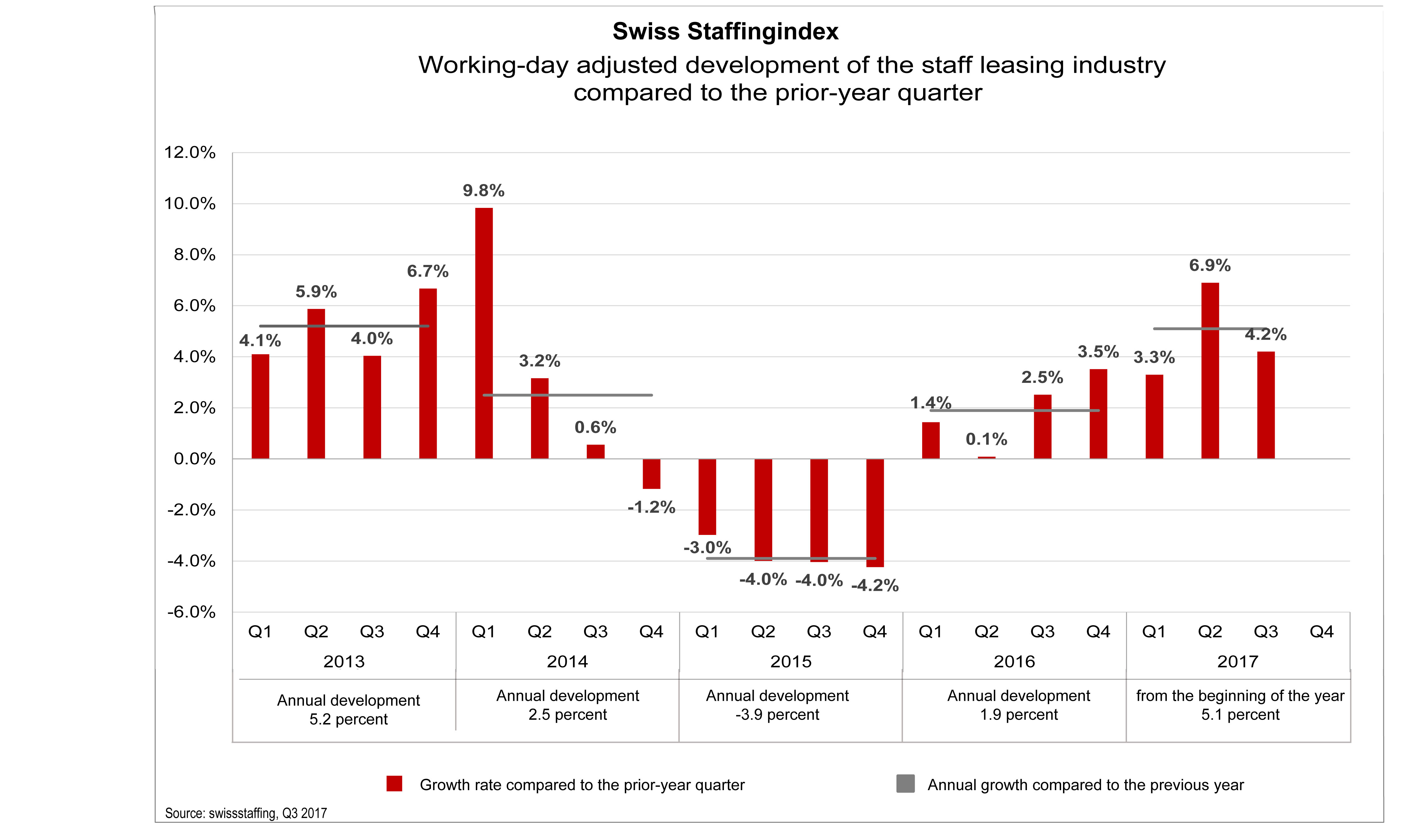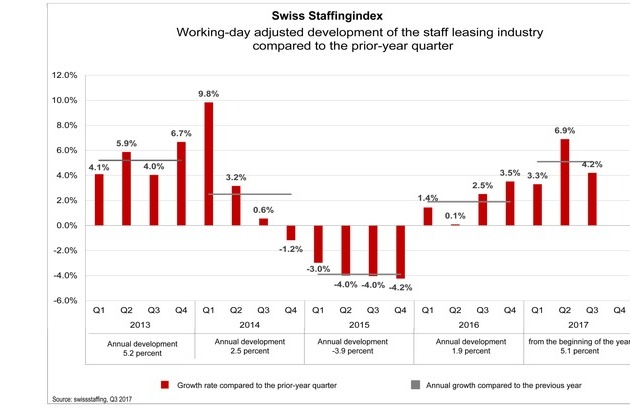 In the third quarter of 2017, staff leasing companies were able to fill 4.2 percent more working hours than in the previous year. This is shown by the Swiss Staffingindex, the business barometer of the staff leasing industry. Although growth in the sector slowed somewhat compared to the second quarter, it remained solid. After numerous well-known economic research institutes have revised their expectations for this year's GDP growth downward, this development is surprising. The robust business activity on the staff leasing market points to an upturn of the economic prospects and a good labor market development in the second half of 2017.