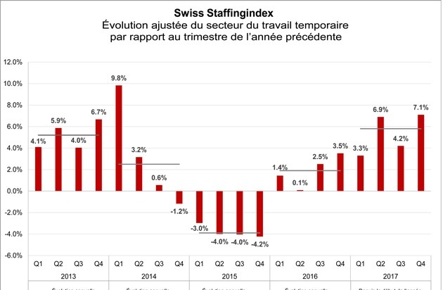 En 2017, le travail temporaire a permis de créer plus de 5 000 emplois en Suisse. Par rapport à l'année précédente, le nombre d'heures travaillées a augmenté de 5,8 %. Après deux années de crise, le secteur envoie ainsi un signal positif de développement économique global: au début de toute phase de croissance, les entreprises ont par expérience recours à des travailleurs temporaires afin de gérer la hausse de leurs commandes. Une croissance solide est donc attendue en Suisse en 2018.