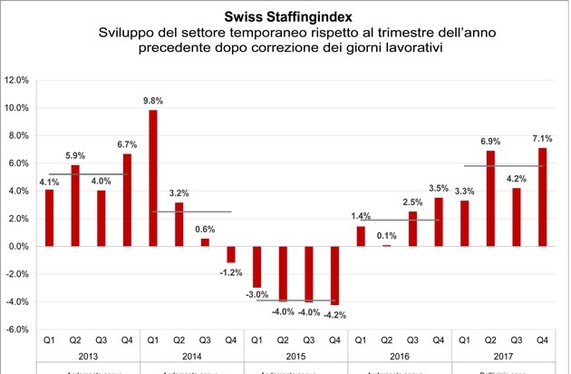 Nel 2017 sono stato creati in Svizzera oltre 5'000 posti di lavoro grazie all'occupazione temporanea. Rispetto all'anno precedente il numero di ore di lavoro prestate è aumentato del 5,8 per cento. Dopo due anni di crisi il settore lancia così un segnale positivo per lo sviluppo dell'intera economia: all'inizio di una fase di crescita le aziende, alla luce dell'esperienza, puntano sulla forza lavoro temporanea per far fronte al costante aumento degli ordini. Pertanto per il 2018, in Svizzera, si può pronosticare una vigorosa crescita.