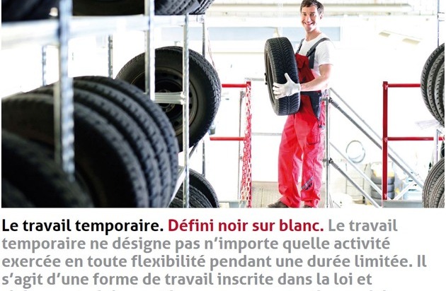 Tout au long de cette année charnière, swissstaffing placera le travail temporaire et les services de l'emploi au centre de sa campagne d'image, dont le site web disponible en plusieurs langues, www.le-travail-temporaire.ch, constitue la pièce maîtresse. Un outil d'information multimédia qui permet aux personnes intéressées de se renseigner sur les nombreuses possibilités et opportunités du travail temporaire, sur l'avenir du travail avec les thèses passionnantes du Gottlieb Duttweiler Institut (GDI), sur les différentes offres des prestataires des services de l'emploi ainsi que sur les origines du travail temporaire. Car le travail temporaire cache de formidables histoires, des chances insoupçonnées et de précieuses informations.
