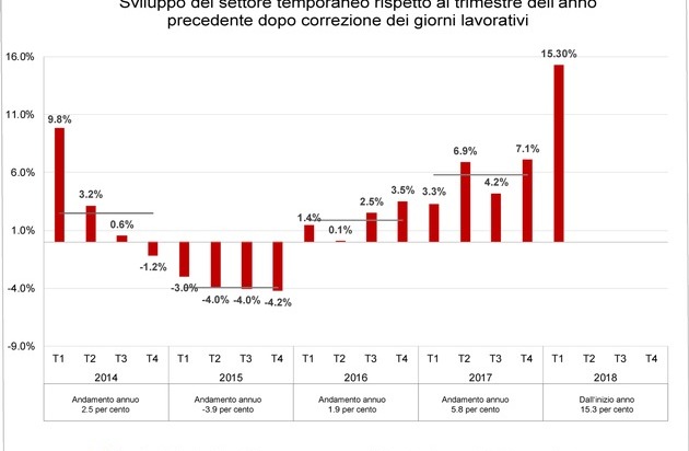 La ripresa congiunturale si fa sentire nel mercato del lavoro svizzero. Grazie al buon andamento degli ordini e alla stabilità dei consumi le aziende in tutti i settori assumono nuovi dipendenti. Nel primo trimestre i prestatori di servizi per il personale hanno potuto osservare questa tendenza nell'incremento dei volumi di ordini. Il numero di ore lavorate è aumentato del 15,3 per cento rispetto all'anno precedente - valore utilizzato per misurare la performance nel settore del lavoro temporaneo. Così per la prima volta dall'istituzione dello Swiss Staffingindex si è registrato un tasso di crescita del settore a due cifre.