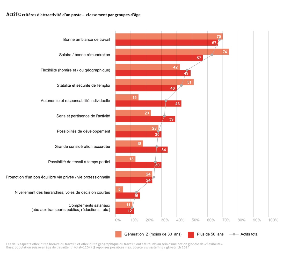 Les priorités des actifs varient énormément selon l'âge: la jeune génération Z place le salaire en haut du classement des critères d'attractivité d'un poste. Elle accorde également plus d'importance à la sécurité de l'emploi que n'importe quelle autre classe d'âge. À l'inverse, les plus de 50 ans sont davantage en quête d'autonomie, de flexibilité et de sens.
