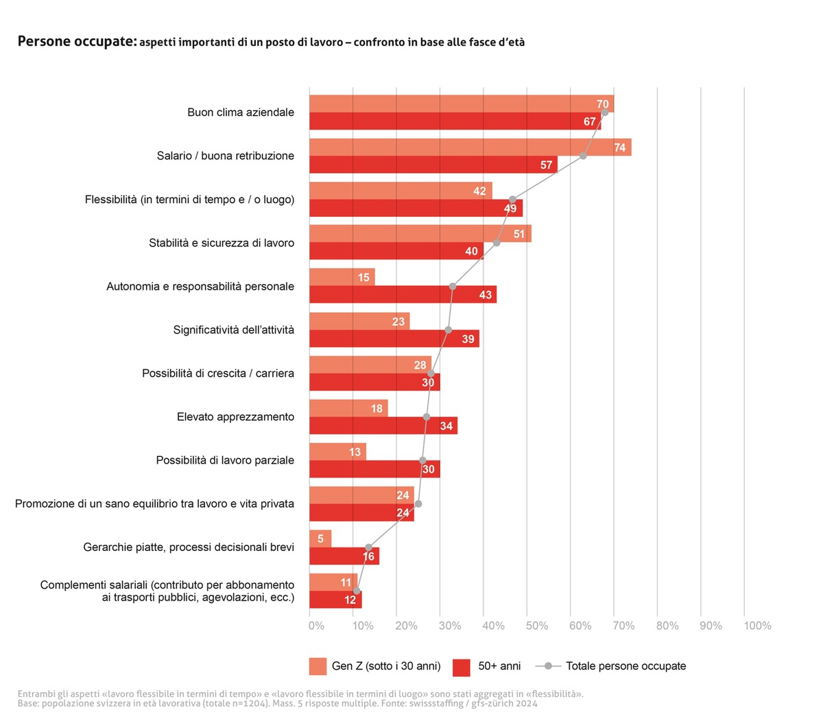 Le priorità delle persone occupate variano fortemente in base all'età: per i giovani della Generazione Z, il salario è al primo posto e per loro la sicurezza del posto di lavoro è più importante che per qualsiasi altra fascia d'età. Al contrario, la generazione degli over 50 attribuisce maggiore importanza all'autonomia, alla flessibilità e alla significatività.