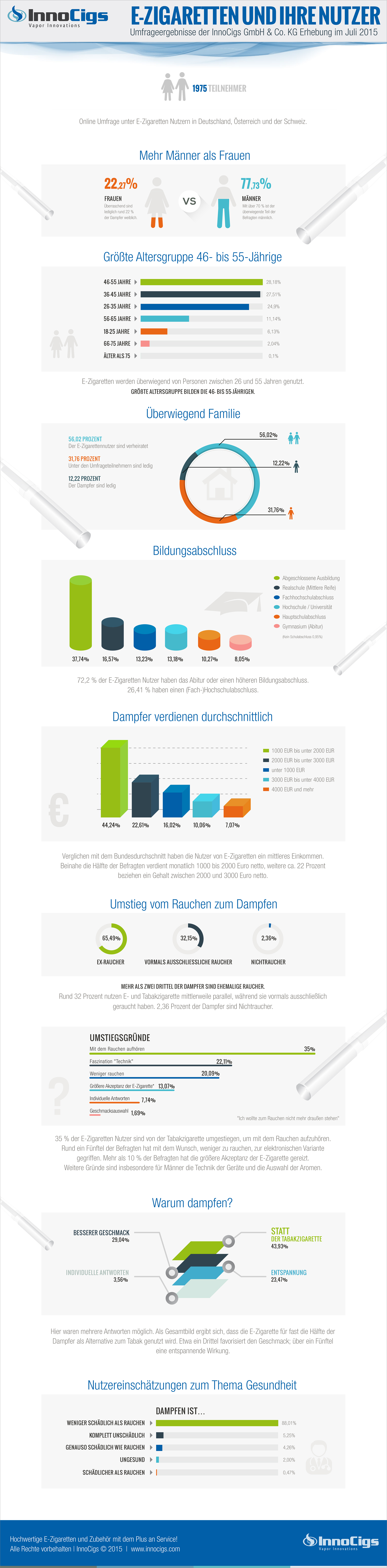 Das Hamburger E-Zigaretten Unternehmen InnoCigs hat rund 2000 E-Zigarettennutzer nach ihren Meinungen zur E-Zigarette, ihren Nutzungsmotiven und -gewohnheiten sowie ihrem sozioökonomischen Hintergrund befragt. Herausgekommen ist Überraschendes.