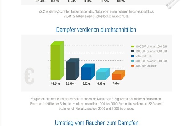 Den Umfrageergebnissen zufolge führt der Weg zu 98 Prozent von der Tabak- zur E-Zigarette, nicht umgekehrt. Rund zwei Drittel der Dampfer sind ehemalige Raucher, 32 Prozent sind Raucher, die neben der elektrischen Zigarette noch gelegentlich auf normale Tabakzigaretten zurückgreifen. Nur 2 Prozent sind ehemalige Nichtraucher.