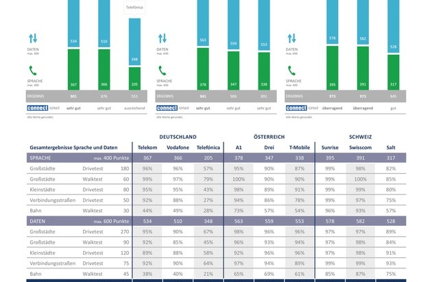 In der Schweiz kommt es dieses Jahr überraschend zu einem Doppelsieg auf höchstem Niveau. Vorjahressieger Sunrise und Markführer Swisscom teilen sich das Siegerpodest mit jeweils 973 Punkten. Zum ersten Mal in der Geschichte des Netztests in Deutschland, Österreich und der Schweiz vergibt connect die Gesamtnote "überragend" an zwei Anbieter aus demselben Land. Der kleinste Schweizer Anbieter Salt verbessert sich in diesem Jahr in der Datendisziplin, büßt jedoch in der Sprachwertung Punkte ein und schneidet mit 845 Punkten mit "gut" ab.