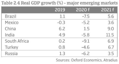 Auch für Russland liegt die BIP-Prognose im Minus und beläuft sich in 2020 voraussichtlich auf -6,2%. Das Land, dessen Haupteinnahmequelle Öl ist, wurde von Covid-19 getroffen als es sich mit Saudi-Arabien in einem Preiskampf befand. Der anhaltend niedrige Ölpreis und die bestehenden Handelsblockaden, wie die Nachfrage nach Öl, beeinflussen die Wachstumsprognose nun zusätzlich negativ.