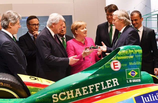 Gesellschafter Georg F. W. Schaeffler hat Bundeskanzlerin Angela Merkel auf dem Schaeffler-Messestand auf der Internationalen Automobilausstellung IAA begrüßt. Gemeinsam mit Klaus Rosenfeld, Vorstandsvorsitzender der Schaeffler AG, und Matthias Zink, Vorstand Automotive, begleitete er die Kanzlerin ein Stück auf ihrem offiziellen Messerundgang.