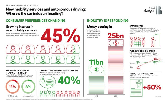 Immer mehr Menschen würden lieber Robotaxis fahren, als ein eigenes Auto zu besitzen: Unter Stadtbewohnern in den USA sind es bereits 40 Prozent, unter jungen Chinesen 26 Prozent. Auch der Anteil der Menschen, die Carsharing, Ridesharing oder Taxis nutzen, steigt: In Deutschland hat er sich in nur einem Jahr verdoppelt. Diese Daten, die die Automobilexperten von Roland Berger für den neuen "Automotive Disruption Radar" weltweit erhoben haben, belegen einen unaufhaltsamen Trend, der die Autoindustrie umkrempeln wird: Mit ihrem traditionellen Geschäftsmodell - dem Verkauf von Neuwagen - wird sie alleine nicht mehr bestehen können.