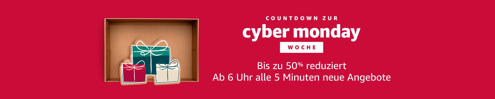 zehntausenden AngebotenAm 20. November 2017 läutet Amazon offiziell die Schnäppchensaison ein. Bis einschließlich 27. November 2017 finden Kunden unter www.amazon.de/angebote über 55.000 Angebote mit bis zu 50 Prozent Rabatt. Die ganze Woche lang gehen täglich zwischen 6.00 Uhr und 19.45 Uhr Blitzangebote im 5-Minuten-Takt online. Angebote sind für maximal sechs Stunden verfügbar, können blitzschnell ausverkauft sein und stehen Prime-Mitgliedern exklusiv 30 Minuten vorab zur Verfügung. Zusätzlich gibt es täglich ausgewählte Top-Produkte als Angebote des Tages, die jeweils schon ab Mitternacht für 24 Stunden erhältlich sind, solange der Vorrat reicht. Auch bei AmazonFresh und dem ultraschnellen Lieferservice Prime Now können sich Kunden auf zahlreiche Angebote während der Cyber Monday Woche freuen.