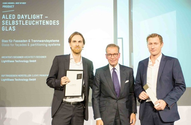 Die Technologie ALED Daylight des Smart Glass Technologieunternehmens wurde im Rahmen der Verleihung in München als richtungsweisende Innovation für den Baustoff Glas als Lichtquelle in der Architektur gewürdigt. LightGlass setzte sich damit beim Iconic Award 2015 gegen 600 internationale Einreichungen durch. Der renommierte Iconic Award hat dieses Jahr die höchste Anerkennung an LightGlass verliehen. Das österreichische Technologieunternehmen gewann den internationalen Award ([http://www.iconic-architecture.com/iconic-awards.html] (http://www.iconic-architecture.com/iconic-awards.html)) in der Hauptkategorie "Product" mit der Auszeichnung "Best of Best". Die Jury begründete ihre Entscheidung mit der wegweisenden Innovation, Tageslicht in hoher Qualität zu simulieren und Licht als Bestandteil der Architektur zu integrieren. Mit ALED Daylight wird Glas selbst zur Lichtquelle. Felix Zabel, Managing Partner von LightGlass: "Bei ALED Daylight handelt es sich um eine patentierte Technologie, die es ermöglicht, transparentes Glas per Knopfdruck im gesamten Farbspektrum flächig zu beleuchten. Da das Glas in jedes bestehende Architekturelement eingebaut werden kann, sind wir in der Lage, unsere Technologie branchenübergreifend an internationale Industriepartner zu lizenzieren. ALED Daylight ist großflächig, von langer Lebensdauer, stromsparend und kostengünstig, und so eine überzeugende Alternative zu OLED." Begründung der Jury für die Verleihung der Auszeichnung "Best of Best" (Auszug): "Ein absolut faszinierendes System, das das Thema Beleuchtung völlig neu interpretiert". LightGlass Video "The Evolution of Light": [http://www.lightglass.net/intro] (http://www.lightglass.net/intro) Ausgezeichnet wurden internationale Einreichungen mit einem besonderen Mehrwert und gestalterischer Exzellenz in der Architektur. Die LightGlass Technology GmbH befindet sich mit ihrer Auszeichnung dabei in hochkarätiger Gesellschaft mit Unternehmen wie Saint Gobain, Philips, Samsung, Seele, 3M, Dorma oder der Lindner Group. Paul Brettschuh, CEO von LightGlass: "Der Iconic Award ist eine internationale Auszeichnung für visionäre und innovative Lösungen und dadurch eine großartige Anerkennung für unsere zukunftsweisenden Technologien. Wir entwickeln einzigartige Lösungen zu interaktiver Glasarchitektur und raumsparenden Smart Glass-Anwendungen. Die Auszeichnung mit ?Best of Best? zeigt, dass wir mit den von uns entwickelten Technologien für den Baustoff Glas einen nachhaltigen Mehrwert für unsere heimischen und internationalen Kunden, Partner und Investoren bieten." Die Einsatzgebiete der LightGlass Technologien sind weit gestreut: Fenster, Türen, Fassadenelemente, Reinräume, Trennwandsysteme, Trockenbau, Aufzugssysteme, Hospitaltechnik sowie P.o.S.-Lösungen. Mit ALED Daylight revolutioniert das Wiener Unternehmen sowohl die Glas- als auch die Lichtindustrie. Über den Iconic Award: Der Iconic Award ist der erste neutrale internationale Architektur- und Designwettbewerb, der die Disziplinen in ihrem Zusammenspiel berücksichtigt. Prämiert werden visionäre Architektur, innovative Produkte und nachhaltige Kommunikation aus allen Sparten der Architektur, der Bau- und Immobilienbranche sowie der produzierenden Industrie in fünf Hauptkategorien. Damit will der Wettbewerb den Blick auf die elementare Bedeutung des Zusammenspiels einzelner Lösungen lenken. Der Fokus liegt auf der ganzheitlichen und konsistenten Inszenierung von Produkten in der Baukunst. Über LightGlass: Die LightGlass Technology GmbH wurde 2014 gegründet. Das Wiener Unternehmen entwickelt und lizenziert visionäre Smart Glass-Technologien für die internationale Industrie, wie selbstleuchtendes Glas in Tageslichtqualität und Glas mit integrierten technischen Modulen. Das Technologieunternehmen ist spezialisiert auf Smart Glass sowie technische Glaslösungen für den Architekturbereich. Die weltweit patentierten Technologien werden an führende Unternehmen vergeben, die in den Bereichen Glas und Licht, aber auch in den Bereichen Fenster, Türen, Reinraum, Aufzüge, Trennwände, Trockenbau, Fassaden tätig sind. Neben dem Angebot eines breiten Technologieportfolios entwickelt LightGlass auch exklusiv kundenspezifische Spezialanwendungen für internationale Großunternehmen. LightGlass Technologien haben weltweite Alleinstellungsmerkmale und sind dafür mehrfach international ausgezeichnet worden. Zuletzt wurde LightGlass im November 2015 unter knapp 1.000 Einreichungen mit dem 1. Platz beim GEWINN Jungunternehmer-Wettbewerb prämiert.