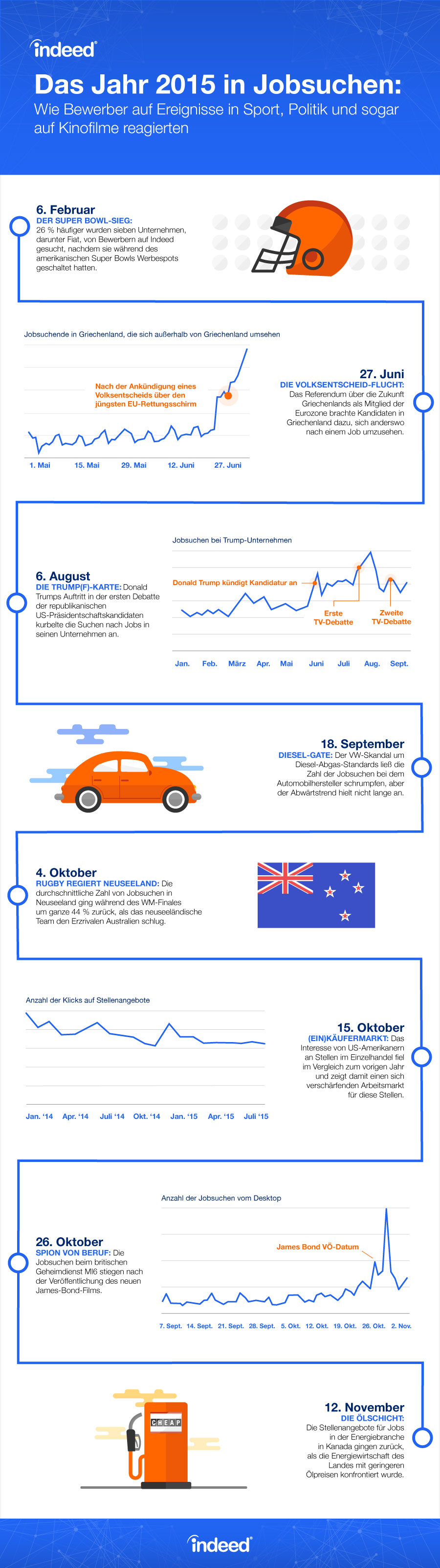 Super Bowl, James Bond, Griechenland stimmt über den Euro ab, Donald Trump poltert in TV-Debatten, Volkswagen schummelt bei Abgaswerten oder Neuseeland gewinnt die Rugby-Weltmeisterschaft - alle Ereignisse schlagen sich in den Anfragen bei Indeed, der weltweit größten Jobseite, nieder. Wie genau, das zeigt eine Infografik.