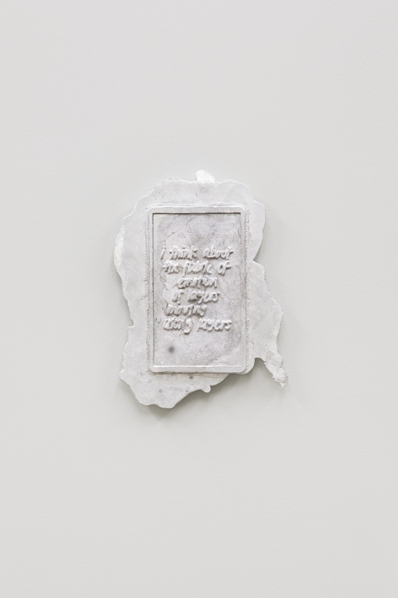 Ein Korridor, der zwei Räume verbindet, ist perspektivisch so leicht verschoben, dass beim Durchschreiten ein Gefühl von Ungleichgewicht oder Irritation entsteht. Gegossene Aluminiumtafeln tragen poetische Sätze; die Bildmotive der Karten sind nur als entfernte Resonanz präsent. Der leicht florale Duft des Moleküls Hedion durchzieht den Raum und erweitert ihn mit einem sinnlichen Impuls und dem Potenzial, unsere Emotionen zu beeinflussen.