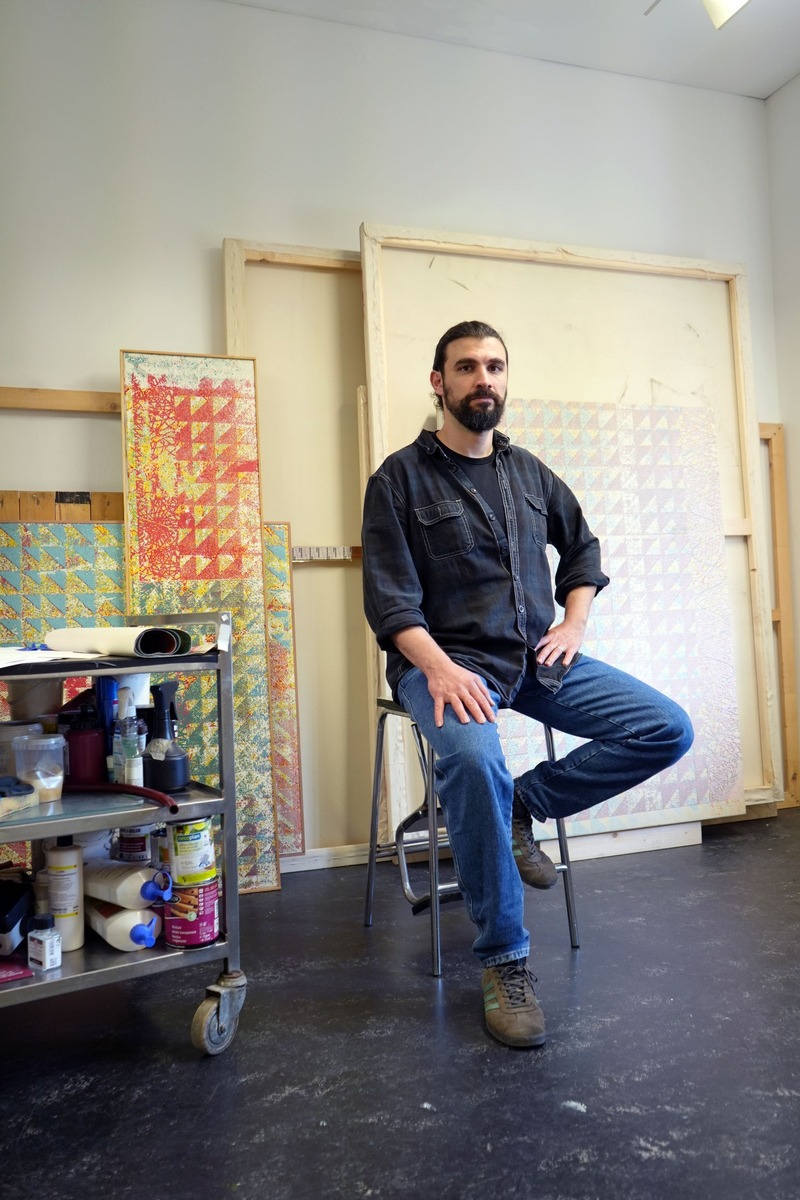 Ahmad Al Rayyan thematisiert in seinen Arbeiten Erfahrungen von Zwangsmigration, Exil und Bürokratie. Seine Gemälde entstehen im Siebdruckverfahren aus vielfach überlagerten, geometrischen Mustern, die an arabische Ornamentik erinnern. Bei näherer Betrachtung offenbaren sie individuelle Merkmale von Dokumenten, etwa von Zugfahrkarten – alltägliche Objekte, die Gegensätze wie Freiheit und Einschränkung, Mobilität und Stillstand sichtbar machen. Al Rayyans Werke verweisen auf Erlebnisse als Staatenloser: auf die durch Konflikte erzwungene Vertreibung aus dem Herkunftsland und das anschliessende Aufnahmeverfahren im Schweizer Rechtssystem.