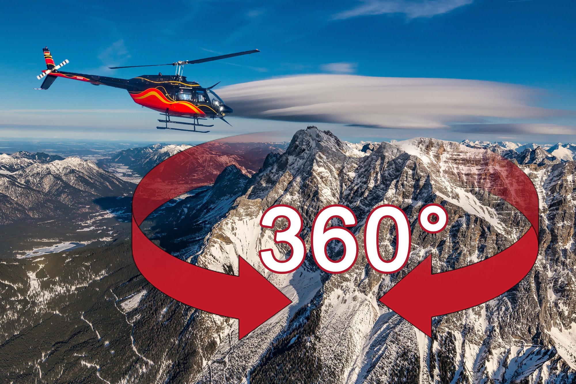 "Wir wollen unseren Kunden mit neuen Technologien die Faszination des Fliegens an besonderen Orten näherbringen," sagt Mario Lang. Für die Zugspitzen-Produktion starteten zwei mit neuester Video-Technologie ausgestattete Hubschrauber von Kempten im Allgäu. 360-Grad-Videos in 4K-Qualität sind eine besondere Neuheit und werden mit sechs GoPro-Kameras gedreht. Durch das Schwenken des Mobiltelefons oder Tablets oder durch ziehen der Maus kann der Zuschauer die Perspektive während des Fluges selber in alle Richtungen drehen. Besonders intensiv wirkt das Video in Verbindung mit einer VR-Brille (Virtual Reality).