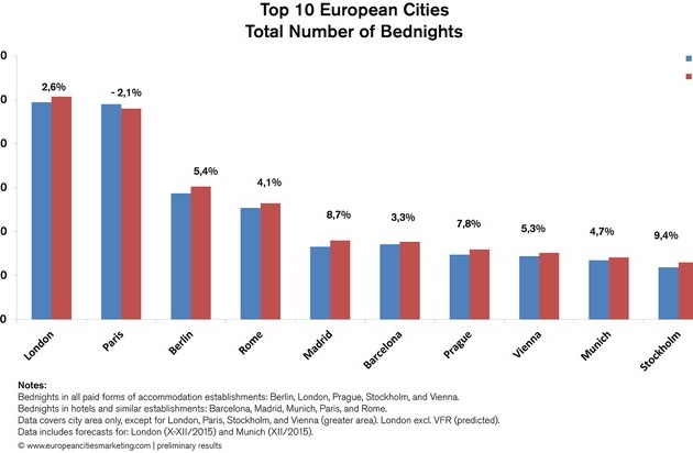 London und Paris verbuchten zusammen rund 100 Millionen Nächtigungen und führten damit 2015 erneut die europäische Spitze der meistbesuchten Städte an. Ein Rückgang von 2,1% in Paris ist vor allem auf die Terroranschläge zurückzuführen. Berlin konnte mit dem 3. Platz, und einem neuen Rekordwert von 30 Millionen Gesamtnächtigungen, seine Position in den Top 5 halten, genauso wie Rom den 4. Platz. Das anhaltende Kopf-an-Kopf-Rennen um den fünften Rang entschied Madrid 2015 für sich. Mit einem Nächtigungsplus von 8,7% ließ die spanische Hauptstadt Barcelona hinter sich, nachdem sie sich zwei Jahre lang mit dem sechsten Platz begnügen musste. Betrachtet man die Nächtigungen internationaler Gäste, wurde unter den Top-10 Städten ein überdurchschnittliches Wachstum von Madrid (+12,8%), Berlin (+9,1%), Budapest (+6,9%), Prag (+7,0%), Wien (+6,1%) und Rom (+4,7%) verzeichnet.