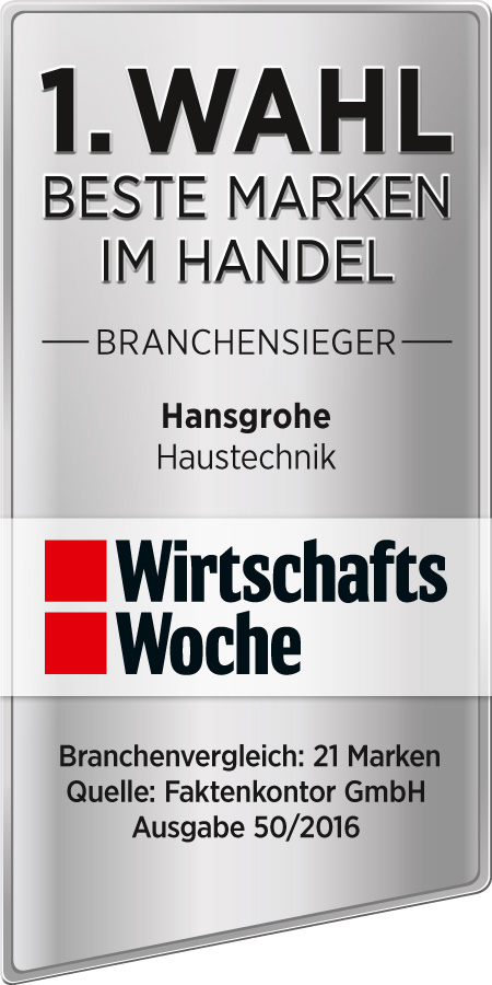 Bei der Studie "1. Wahl 2016 - Beste Marken im Handel" erzielte die Hansgrohe Group mit ihren Marken AXOR und hansgrohe Platz eins, mit deutlichem Abstand zu den 20 weiteren analysierten Marken der Kategorie Haustechnik. Im Auftrag der WirtschaftsWoche wurden insgesamt 950 Marken aus 20 Branchen im Internet ausgewertet. Die Untersuchungsbasis bildete dabei nicht eine klassische Umfrage, sondern 4,7 Millionen Kommentare in sozialen Medien wie Facebook und Twitter oder Bewertungen in Foren und Blogs. Herangezogen wurden Kommentare aus dem Zeitraum August 2015 bis Juli 2016, die hinsichtlich ihrer Tonalität analysiert wurden. Für die untersuchten Marken wurden dabei Aussagen zu den Kategorien Preis und Qualität bewertet.