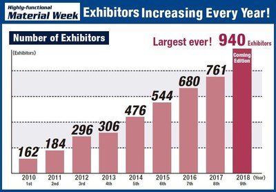 Die "Highly-functional Material Week" wird jedes Jahr größer und zählt dieses Mal 940 Aussteller, 180 mehr als im Jahr zuvor. Parallel dazu finden die "28. FINETECH JAPAN (https://www.ftj.jp/en/?utm_source=newsletter&utm_medium=press&utm_campaign=pr_newswire_1112)" für LCD-/OLED-/Sensortechnologien und die "Photonix 2018 (https://www.photonix-expo.jp/en/?utm_source=newsletter&utm_medium=press&utm_campaign=pr_newswire_1112)" für Laser-/Photoniktechnologien am gleichen Veranstaltungsort statt. Wenn man alle 8 Messen zusammennimmt, werden 1.260 Aussteller und 65.000 Besucher aus 51 Ländern erwartet.