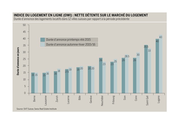 Parallèles avec l'évolution du nombre de logements vacants. Au 1er juin 2015, date de référence du relevé des logements vacants opéré par l'Office fédéral de la statistique, les logements proposés à la location étaient 4,8 fois plus nombreux à Lausanne et 3,2 fois plus nombreux à Zurich que les logements vacants. La tendance observée au niveau du nombre de logements vacants et celle que révèle l'OWI indiquent une détente croissante sur le marché du logement locatif.