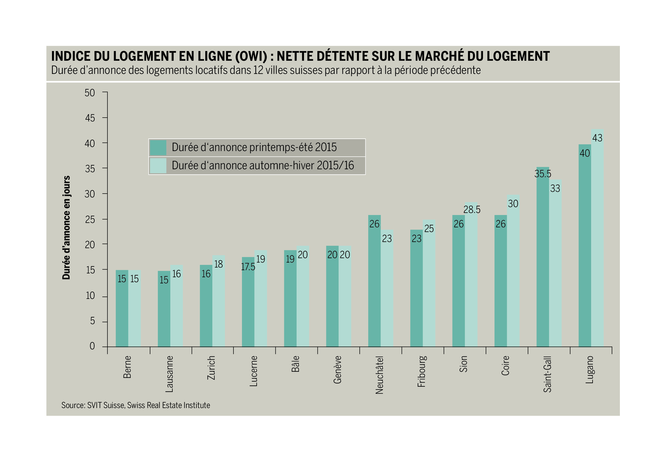 Parallèles avec l'évolution du nombre de logements vacants. Au 1er juin 2015, date de référence du relevé des logements vacants opéré par l'Office fédéral de la statistique, les logements proposés à la location étaient 4,8 fois plus nombreux à Lausanne et 3,2 fois plus nombreux à Zurich que les logements vacants. La tendance observée au niveau du nombre de logements vacants et celle que révèle l'OWI indiquent une détente croissante sur le marché du logement locatif.