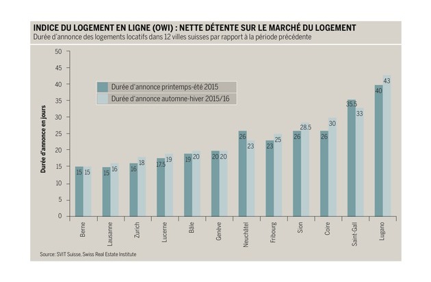 Les durées d'annonce de logements locatifs sur les plateformes Internet se sont sensiblement allongées pendant l'automne-hiver 2015/2016. Cette détente est due à l'augmentation du nombre de logements vacants. Sur le marché suisse du logement locatif, l'offre s'est nettement étoffée par rapport à la période précédente. C'est ce que montre l'indice du logement en ligne (OWI) du SVIT Suisse et du Swiss Real Estate Institute. A Berne et dans le segment des petits logements, l'offre reste restreinte.
