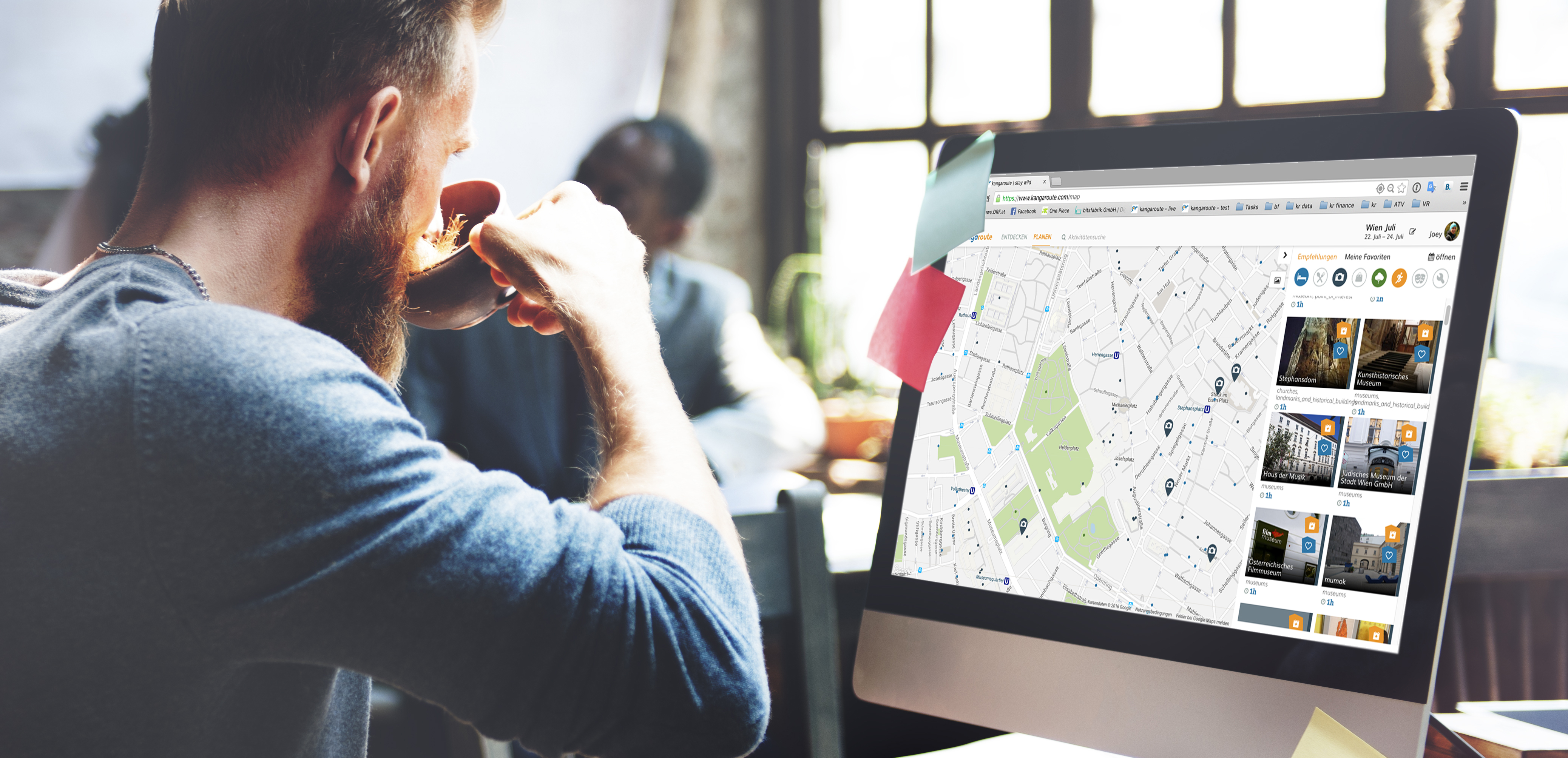 Eine Revolution in der Freizeitplanung steht bevor. Die neue Plattform kangaroute bietet seinen Nutzern ungeahnte Möglichkeiten. Egal ob man am Wochenende etwas Neues ausprobieren will, ein Kurztrip oder eine Reise ansteht, kangaroute liefert jedem Nutzer sein maßgeschneidertes Erlebnis. Basierend auf den Vorlieben und Interessen der User, werden Aktivitäten und Empfehlungen gefiltert und präsentiert. Outdoor-Sportler, Kultur-Interessierte oder Foodies, mit kangaroute kommt jeder auf seine Kosten. Die mobile App ist dabei der ständige (Reise)-Begleiter, liefert wetterbasierte Alternativen und hält alle Infos bereit.