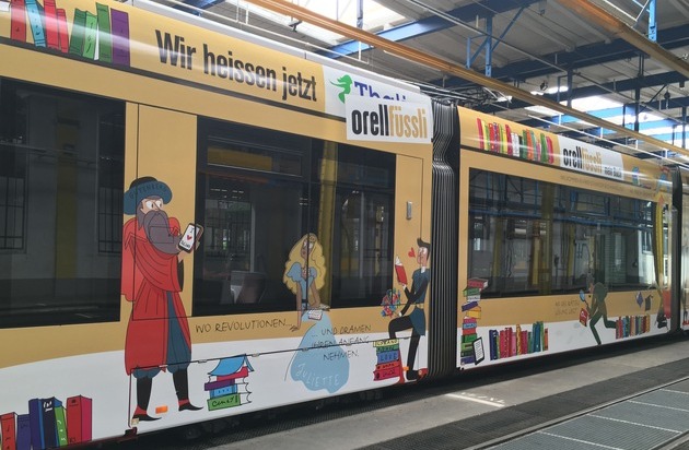 Während drei Monaten - vom 28. Mai bis 28. August 2016 - sind auf den Strassen von Bern und Basel die Orell Füssli-Trams unterwegs. Auf der Aussenverkleidung der Trams sind Illustrationen von bekannten Figuren aus der Welt des Buchs und der Literatur aufgedruckt, während die Fahrgäste im Innern selber in Büchern stöbern können: für die Trambenutzer liegen die aktuellsten Bestseller und begehrtesten Literatur-Klassiker zum Lesen bereit.