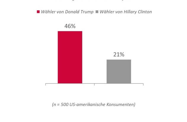 Demnach gab fast jeder zweite (46%) Trump-Wähler und immerhin jeder fünfte (21%) Clinton-Anhänger an, im vergangenen Jahr weniger deutsche Marken gekauft zu haben. Drei Viertel (76%) aller Trump-Wähler ziehen stattdessen den Kauf amerikanischer Produkte vor. Auch jeder zweite Wähler (50%) von Hillary Clinton trifft inzwischen patriotischere Entscheidungen und kauft öfter heimisch ein. Für die Studie wurden Ende 2017 1.000 Konsumenten in den USA und Deutschland befragt.