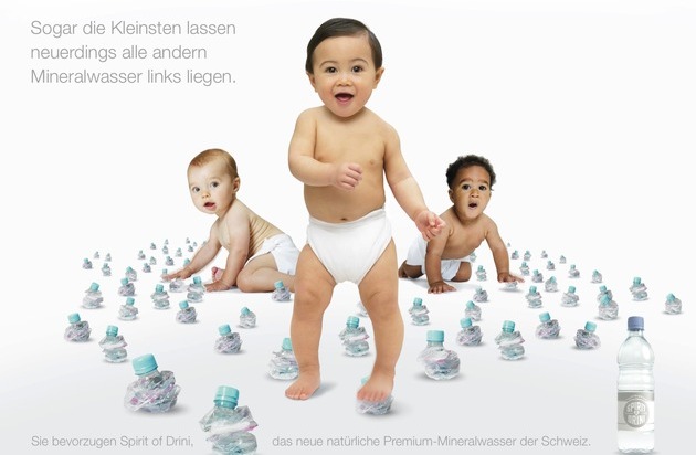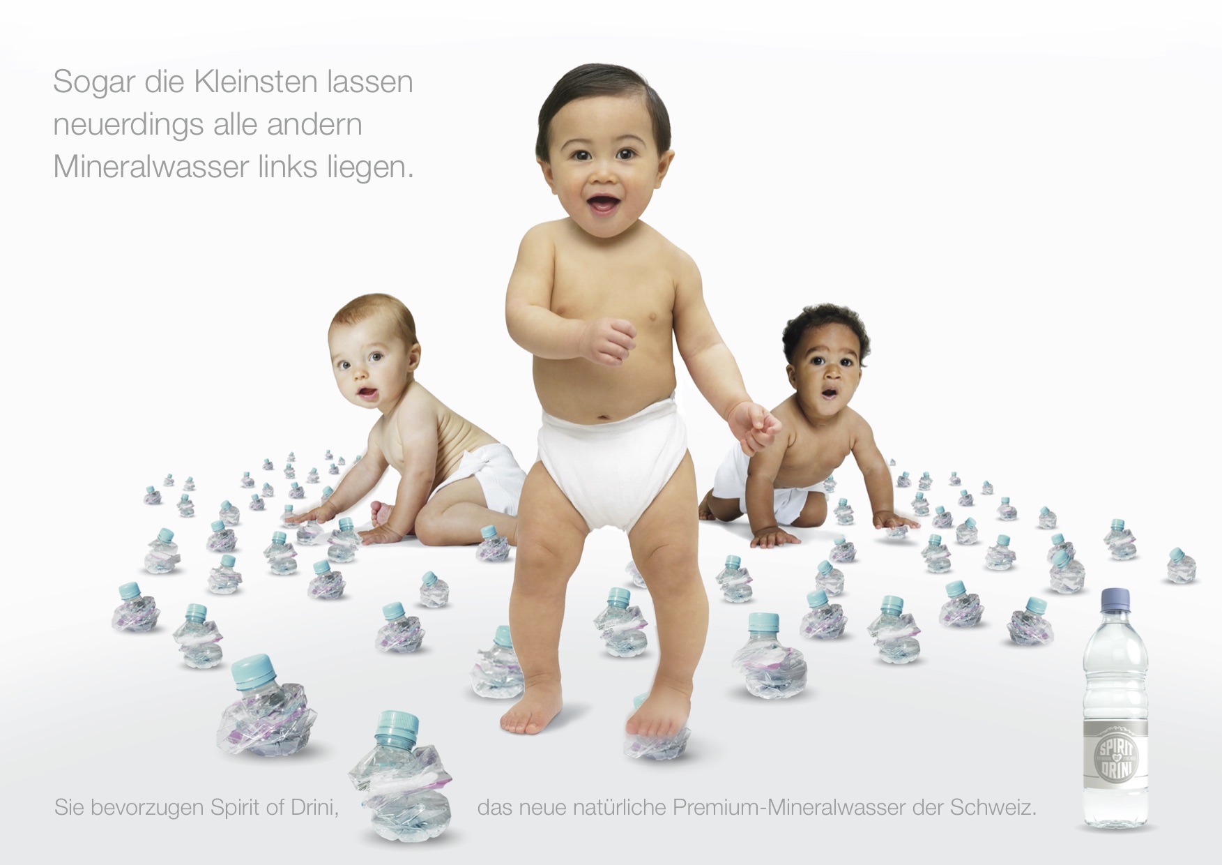 Fast könnte man meinen, es handle sich bei den Werbe-Babys auf besagtem Inserat um jene aus der Werbekampagne eines grossen Mineralwasserabfüllers aus Frankreich - weit gefehlt. Es ist eine in der Schweiz eben erst lancierte Mineralwassermarke mit dem ungewöhnlichen Namen Spirit of Drini, die Babys auf den Flaschen der Konkurrenz herumtrampeln lässt. Sogar die Kleinsten lassen alle anderen Mineralwasser links liegen: Denn Spirit of Drini engagiert sich mit jedem Flaschenverkauf für einen karitativen Zweck - für eine Kinderhilfsorganisation.