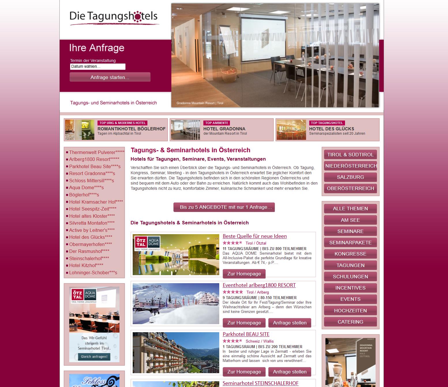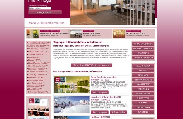 Wer sich schnell einen Überblick über einige der führenden Tagungshotels in Österreich verschaffen will, der ist auf dem im Frühjahr 2016 gelaunchten Portal www.Hotels-Tagung.com richtig. Hier finden sich über 35 Seminar- und Tagungshotels und fast täglich kommen neue, hochqualitative Angebote dazu. Großer Beliebtheit erfreut sich das Portal, da es sehr einfach und gut strukturiert aufgebaut ist, sodass der Besucher mit wenigen Klicks das findet, was er sucht. Dafür ist auch wichtig, dass die Betreiber des Portals auf störende Werbeeinblendungen verzichten und sich rein auf die Tagungshotels und deren Angebote konzentrieren.