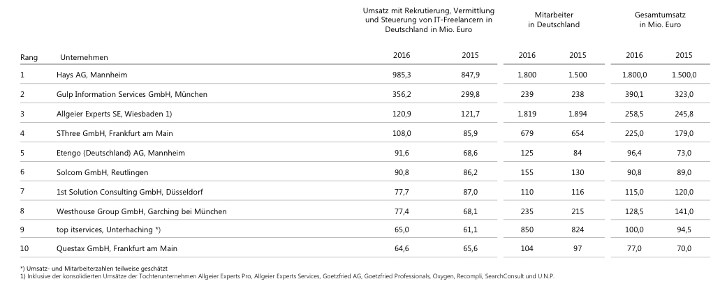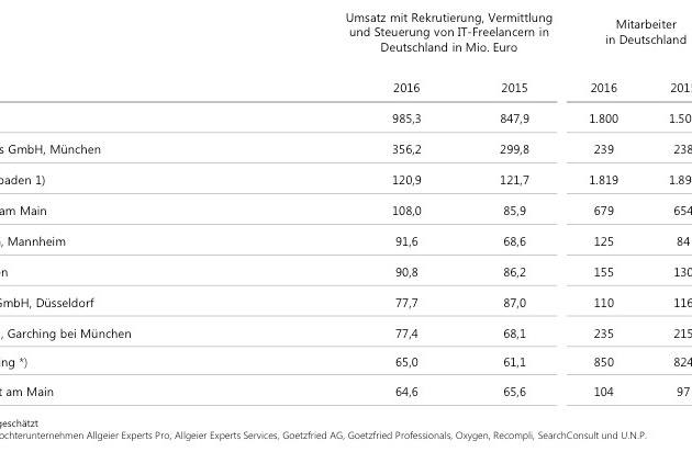 - Nachfrage nach unterschiedlichen Vertragsformen steigtDie Allgeier Experts Group gehört auch in diesem Jahr zu den drei führenden IT-Personaldienstleistern. Zu diesem Ergebnis kommt die neueste Lünendonk-Marktsegmentstudie "Der Markt für Rekrutierung, Vermittlung und Steuerung von IT-Freelancern in Deutschland". Im jährlichen Branchenbarometer des Analystenhauses Lünendonk werden die marktführenden Anbieter nach Umsatz und Mitarbeiterzahl aufgelistet. Mit 258,5 Millionen Euro Gesamtumsatz und 1.819 Mitarbeitern konnte die Allgeier Experts Group 2016 ihr Geschäftsvolumen in Deutschland erneut signifikant steigern. Mit der Rekrutierung und Vermittlung von IT-Freelancern erwirtschaftete Allgeier Experts im abgelaufenen Jahr rund 121 Millionen Euro. Größte Treiber waren dabei Digitalprojekte. Auf Kundenseite steigt parallel dazu die Nachfrage nach ganzheitlichen Personallösungen.