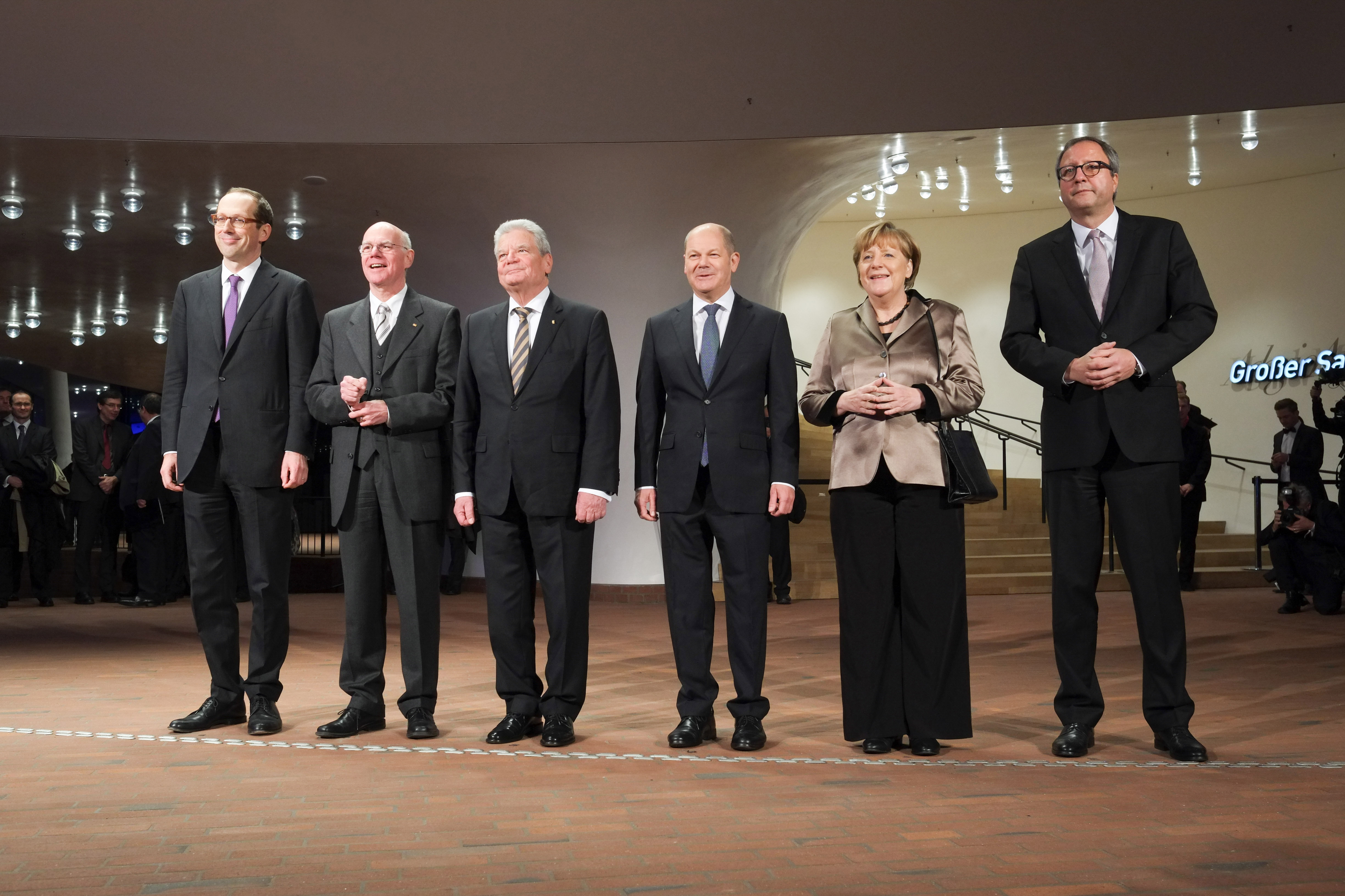 Die Feierlichkeiten zur Eröffnung wurden im Großen Saal mit einem Festakt eingeleitet. Dabei sprachen Bundespräsident Joachim Gauck, Hamburgs Erster Bürgermeister Olaf Scholz, Jacques Herzog vom Architekturbüro Herzog & de Meuron und Generalintendant Christoph Lieben-Seutter. Unter den Gästen waren die deutsche Bundeskanzlerin Angela Merkel und zahlreiche weitere hochrangige Gäste aus Politik und Kultur.