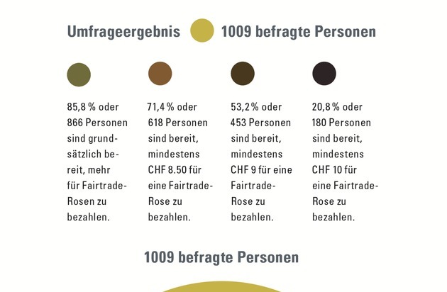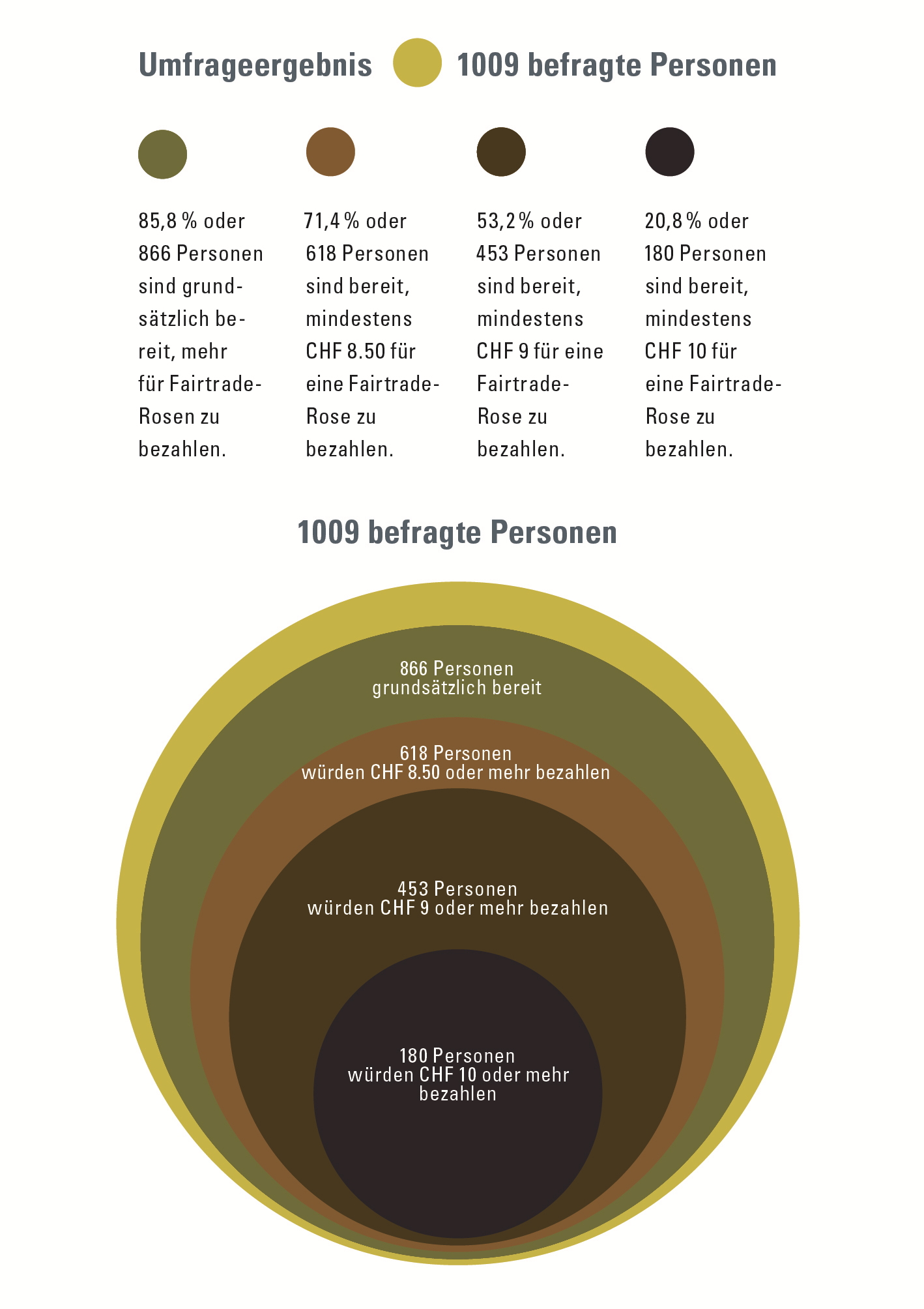 Bei einer langstieligen Rose, die im Durchschnitt 7.50 Franken kostet, scheint der tolerierte Aufpreis bei 1 bis 1.50 Franken zu liegen. Von den gut 85 Prozent, die sich gemäss Umfrage mit einem höheren Preis anfreunden können, erachten über 70 Prozent einen Preis von 8.50 Franken für eine Fairtrade-Rose als akzeptabel. Noch 53 Prozent sind bereit, 9 Franken oder mehr zu bezahlen und gute 20 Prozent fänden sogar einen Preis von 10 Franken oder mehr gerechtfertigt.