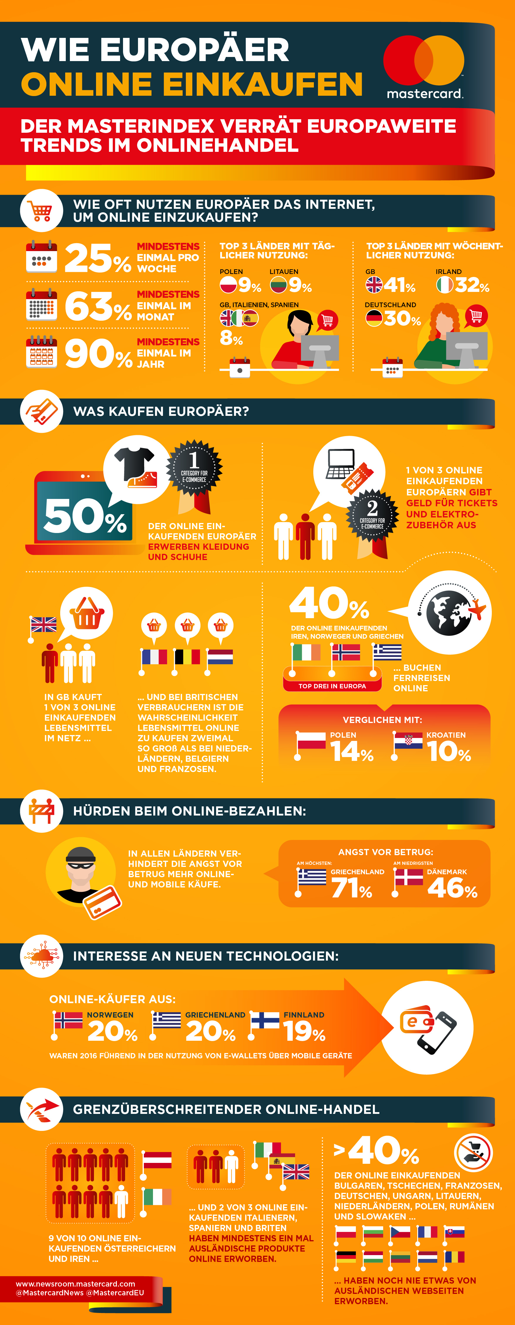 Gemäß des ersten "Masterindex zu europäischem E-Commerce und neuen Bezahlarten" sind Europäer begeisterte Online-Shopper. Die Mastercard-Befragung von Konsumenten in über 20 Ländern im Europäischen Wirtschaftsraum (EWR) zeigt, dass 2016 jeder vierte Internetnutzer in Europa mindestens einmal pro Woche Produkte oder Services online eingekauft hat.