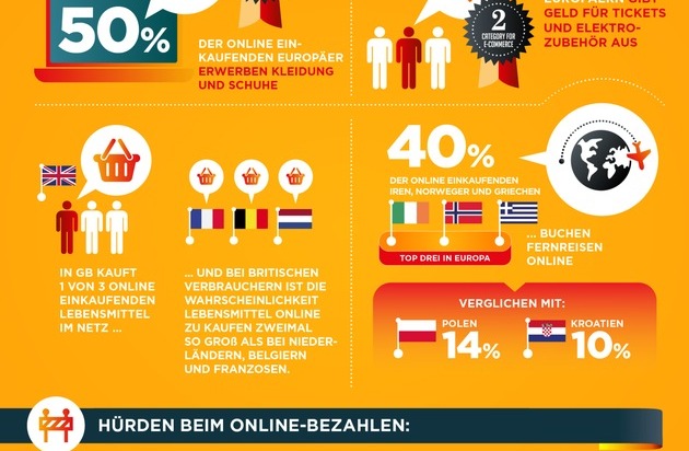 Wenn sich Menschen dazu entscheiden, doch über ihre Landesgrenzen zu schauen, geschieht dies in Deutschland eher wegen der Verfügbarkeit (40%) eines begehrten Produktes als wegen eines reizvollen Angebots (36 %). Die beliebtesten Dinge, die grenzübergreifend bestellt werden, sind europaweit Kleider, Accessoires und Schuhe (37 %, in Deutschland: 25%), gefolgt von Büchern, Musik, DVDs und Videospielen (21 %, in Deutschland: 22%).