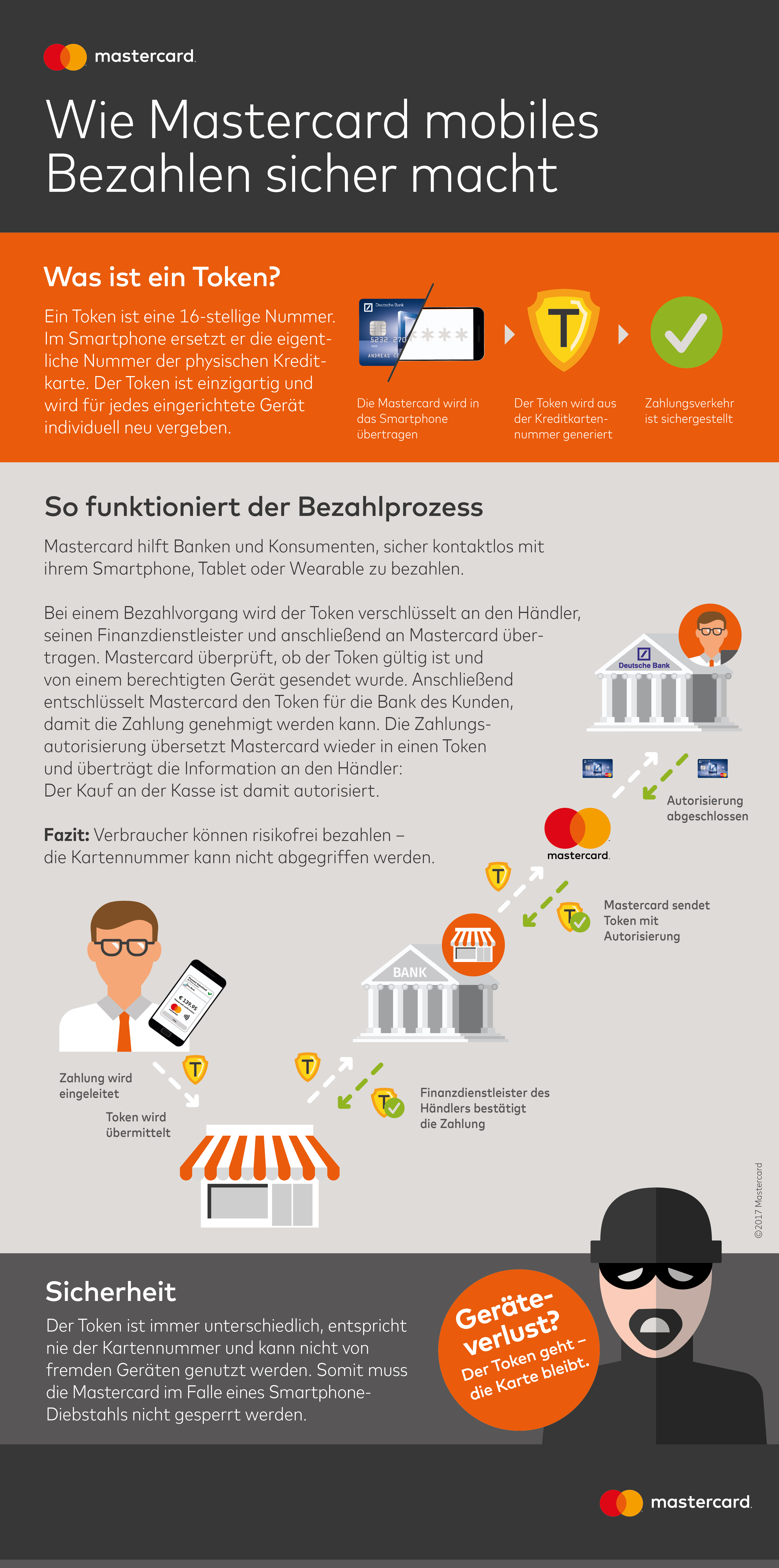 Wenn der Kunde seine Mastercard für das mobile Bezahlen aktiviert, wird eine Kopie der Karte in der App angezeigt. Zusätzlich speichert das Smartphone des Kunden zehn Zahlenschlüssel für jeweils eine Zahlung (sogenannte Token). Für den Kunden bedeutet das zusätzliche Sicherheit: Für die einzelne Zahlung werden nur Token und dessen Ablaufdatum bereitgehalten, nicht aber die vertraulichen Kreditkarteninformationen. Beim Bezahlen erfolgt die Übergabe des Tokens inklusive des Ablaufdatums in standardisierter, verschlüsselter Form an das Kassenterminal. Die Token sind auch dann verfügbar, wenn das Smartphone einmal nicht im Mobilfunknetz oder im Internet eingeloggt ist. Wenn die Token aufgebraucht sind, werden beim nächsten Einloggen in die App über Internet automatisch zehn neue geladen.