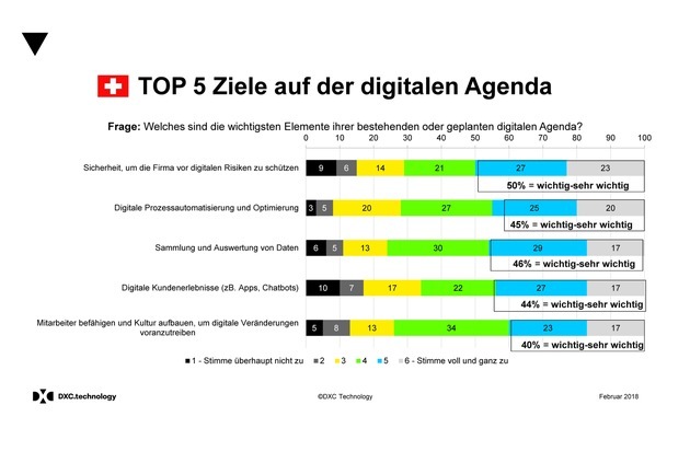 DXC Technology hat die Studie "Digitale Agenda 2020" im Juli 2017 über ein Marktforschungsinstitut durchgeführt. In der Schweiz wurden 100 Führungskräfte mit Entscheidungsbefugnis bei der digitalen Transformation befragt. Branchenschwerpunkte der Studie sind: Industrie, Transport & Verkehr, Telekom + IT, Bauwesen, Gross- und Einzelhandel, Gesundheits- und Sozialwesen, Finanzdienstleister.