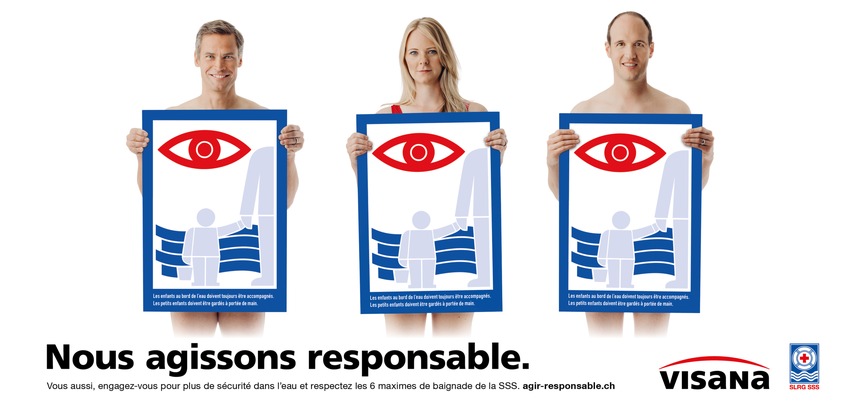 L'année 2018 et la saison de baignade entamée s'annoncent sous des auspices particuliers. Sous la devise «J'agis responsable», la SSS et l'assureur-accidents Visana unissent leurs forces pour promouvoir les maximes de la baignade parmi les amateurs et amatrices de plaisirs aquatiques. Depuis le début de cette semaine, des affiches avec différents ambassadeurs et ambassadrices portant les six maximes de la baignade de la SSS seront installées dans des villes sélectionnées. L'accent est mis cette année sur les deux premières maximes: «Les enfants au bord de l'eau doivent toujours être accompagnés - les petits enfants doivent être gardés à portée de main!» et «Ne jamais se baigner après avoir consommé de l'alcool ou des drogues. Ne jamais nager l'estomac chargé ou en étant à jeun». Au cours des prochaines années, les autres maximes seront également mises en lumière, en alternance. Autre message central de la campagne: il s'agit d'inciter chacun et chacune à adopter un comportement responsable, mais aussi à faire preuve de civisme en promouvant ce comportement auprès d'autrui. C'est pourquoi figurent sur les affiches, en plus de l'ambassadeur de la SSS, Renzo Blumenthal, des bénévoles de Visana et de la SSS, qui portent littéralement les maximes de la baignade et entendent ainsi montrer la voie, en tant que citoyens et citoyennes lambda, afin d'encourager une attitude responsable et sûre vis-à-vis de l'eau.