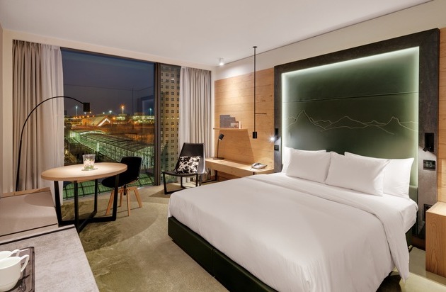 Dieses Jahr auf Platz vier der weltweit besten Flughäfen und Platz eins in Europa von Millionen von Passagieren aus der ganzen Welt gewählt, fungiert der Münchner Flughafen als internationales, verbindendes Drehkreuz. Das Hilton Munich Airport liegt mit seiner Nähe zu den Alpen an einem erstklassigen Standort. Diese Tatsache wurde auch bei der Innengestaltung der Räume berücksichtigt: Unter dem Leitmotiv International Mountain HUB wurde gezielt ein innenarchitektonisches Konzept mit dem Augenmerk auf Lokalität und Wohlfühlflair, aber gleichzeitig auch auf hochmoderne Technik entwickelt. Alle Zimmer wurden im natürlichen Stil und mit einem authentischen Bezug zur Region von JOI Design eingerichtet. Dabei stehen die Themen "Berge" und "Flughafen" im Vordergrund und spiegeln sich im Design wieder. Verwendet wurden dabei Materialien wie helles Eichenholz, Naturstein und Filz. Das moderne Design ist neben der Zimmer ebenfalls in den neuen Badezimmern zu finden. Untypisch für eine Hotelkette, hat das Hilton Munich Airport auch die Gestaltung der Baderäume individuell auf das Motto "Berge" abgestimmt.