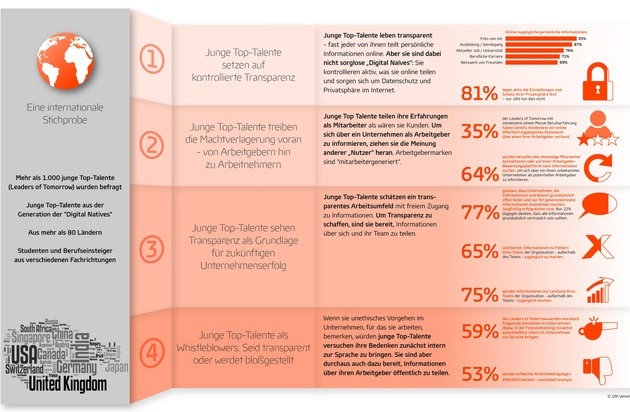 Kontrollierte Transparenz ist in den Augen junger Top-Talente ein wichtiger Erfolgsfaktor. Unternehmen mit einer Kultur, in der Informationen frei fließen können und Vertraulichkeit die Ausnahme ist, profitieren ihrer Meinung nach langfristig.