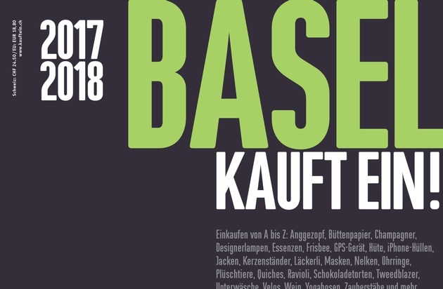 In BASEL KAUFT EIN! 2017/18 finden Sie alles zum Thema Einkaufen. Von A bis Z: Alpkäse, Blumen, Couture, Duftkerzen, Entenleber, Flipflops, Gläser, Handtaschen, Instrumente, Jeans, Kabelbinder, Lampen, Modellflugzeuge, Nigiri, Ohrringe, Plaids, Quarktaschen, Rucksäcke, Schokolade, Tische, Uhren, Velos, Wein, Xenonlampen, Yogamatten, Zahnpasta und mehr.
