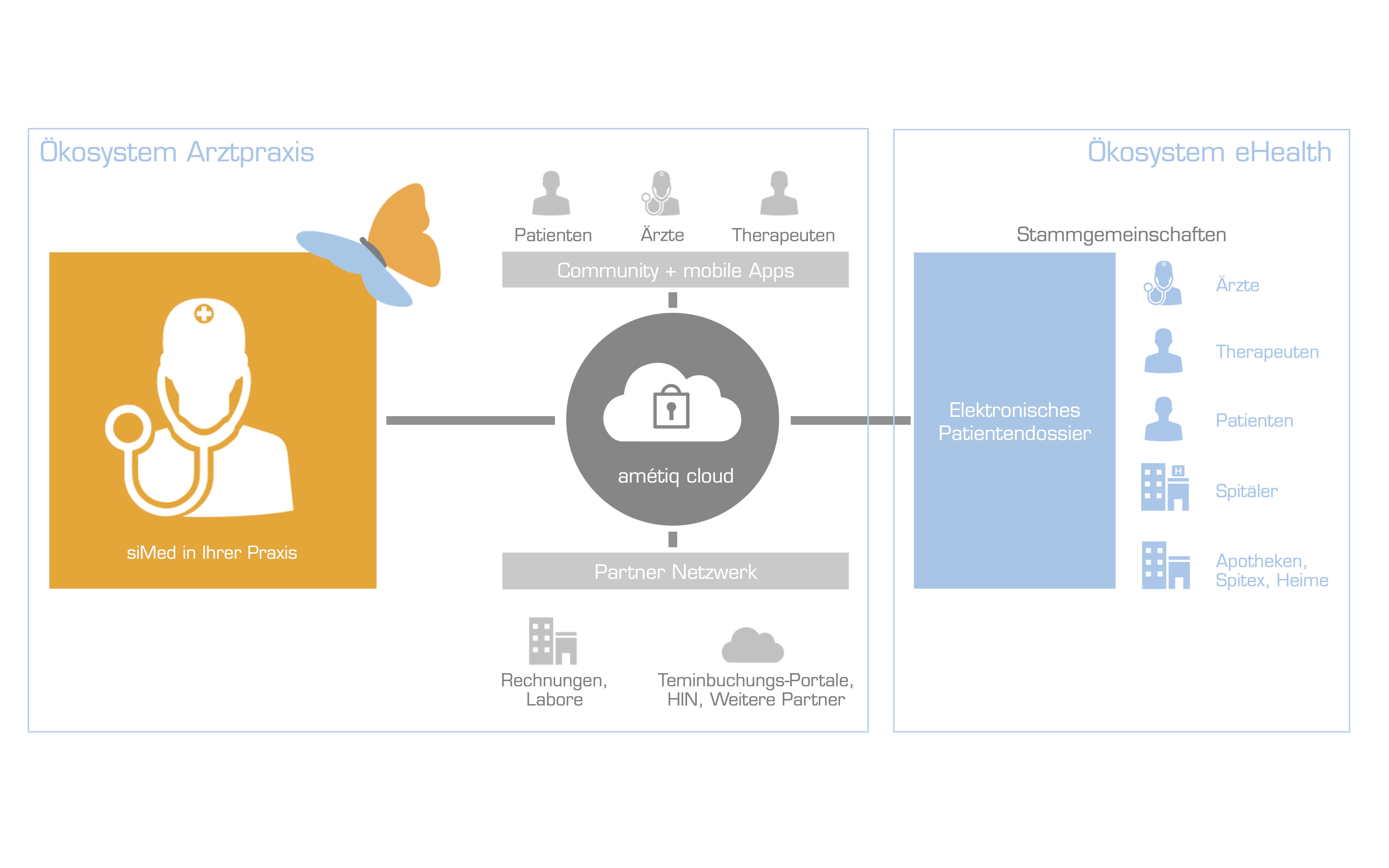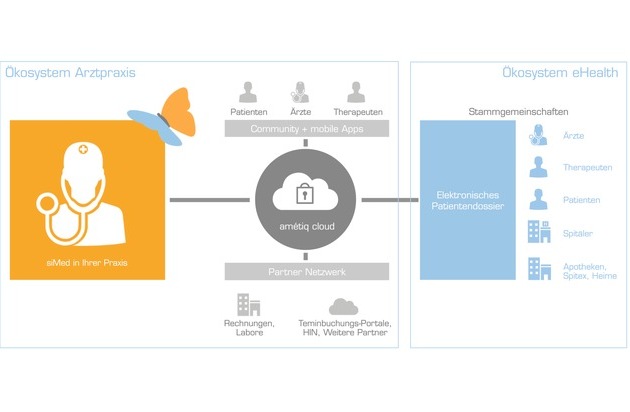 Als Anbieter von Praxissoftware hat sich Amétiq entschlossen, in einem frühen Zeitpunkt wegweisend zu handeln und gründete zu diesem Zweck anfangs 2016 die Tochterfirma Amétiq Connect AG. Sie wird für die Benutzer der eigenen Praxissoftware siMed die zentralen digitalen Prozesse im Ökosystem Praxis sowie den einfachen Zugang zur eHealth-Welt (Ökosystem eHealth) und dem elektronischen Patientendossier entwickeln. Die Investitionen im hohen sechsstelligen Bereich bringen Amétiq-Kunden schon jetzt einen greifbaren Mehrwert, nämlich die Amétiq cloud.